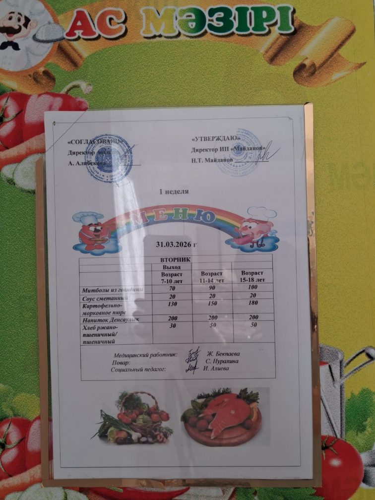 Қабырғада перспективалық және күнделікті мәзір ілінген. Осы мәзірге сәйкес келесі тағамдар дайындалды.