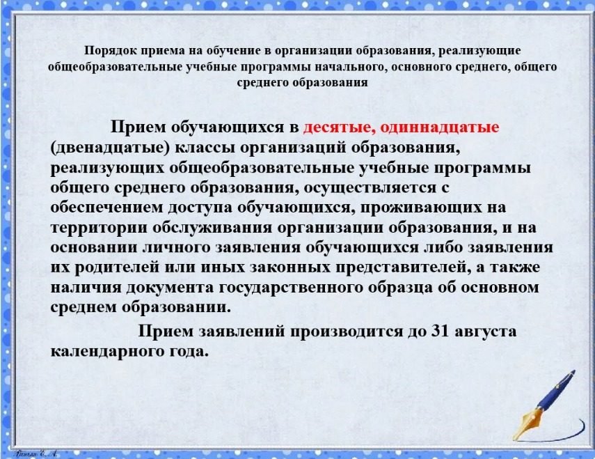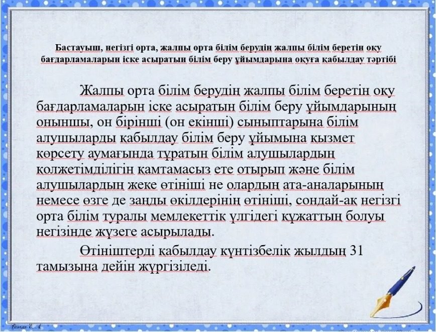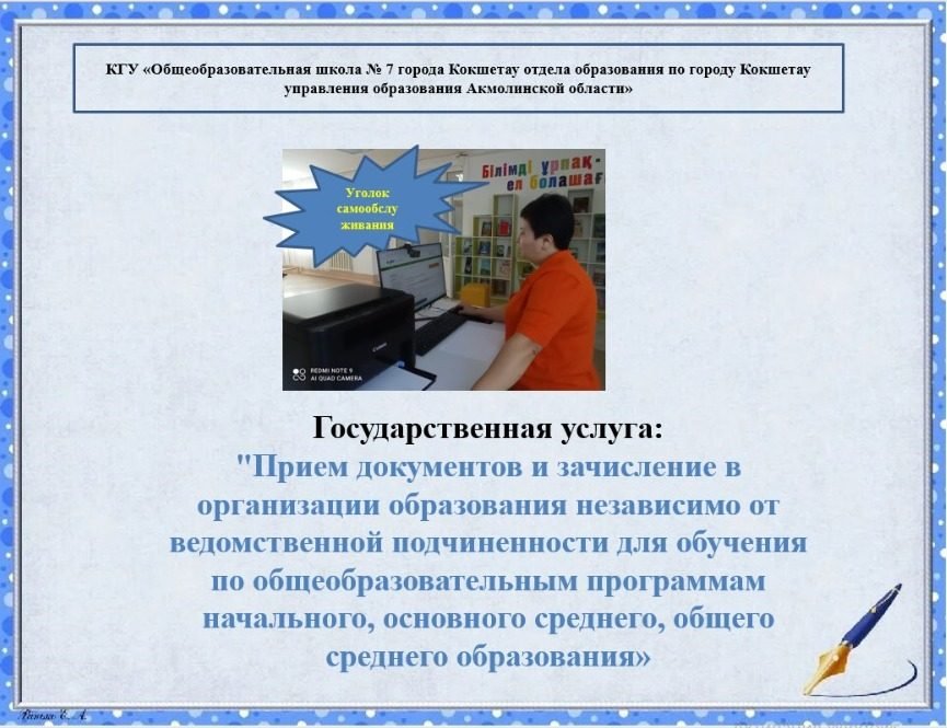 "Бастауыш, негізгі орта, жалпы орта білім берудің жалпы білім беретін бағдарламалары бойынша оқыту үшін ведомстволық бағыныстылығына қарамастан білім беру ұйымдарына құжаттар қабылдау және оқуға қабылдау" мемлекеттік қызмет көрсету.