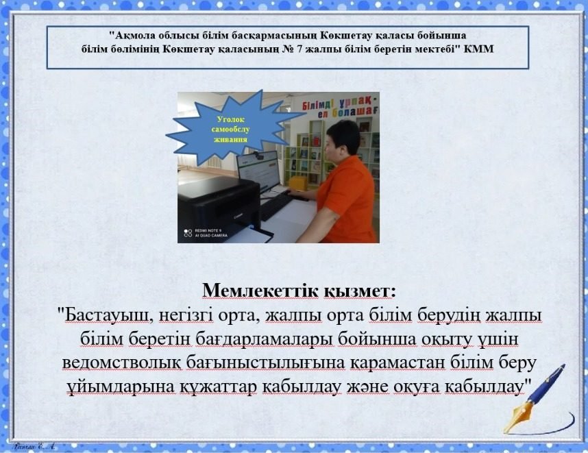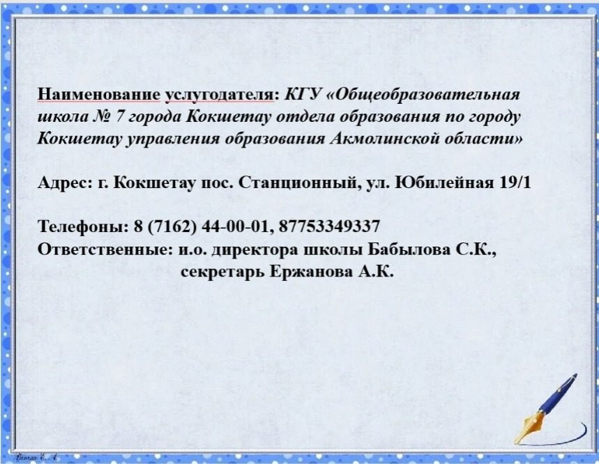 «Ақмола облысы білім басқармасының Көкшетау қаласы бойынша білім бөлімі Көкшетау қаласының № 7 жалпы орта білім беретін мектебі» коммуналдық мемлекеттік мекемесі.