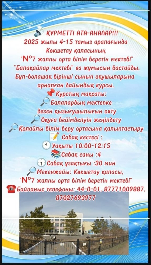 Құрметті ата-аналар ! 2025 жылы 4-15 тамыз арағында Көкшетау қаласының "№7 жалпы орта білім беретін мектебі" "Балақайлар мектебі " өз жұмысын бастайды.